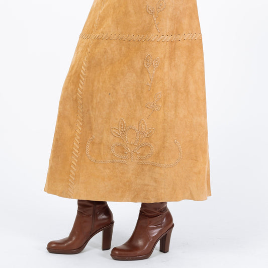 Vintage 90s Tan Suede Floral Patchwork Maxi Skirt - Medium, 30" Waist