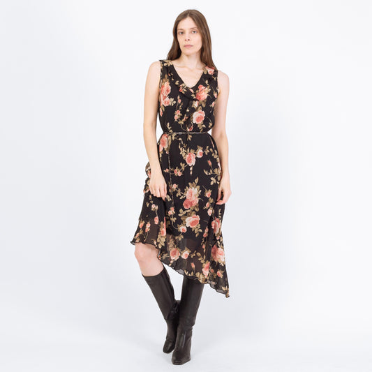 Vintage 90s Sheer Black Floral Asymmetrical Midi Dress - Small
