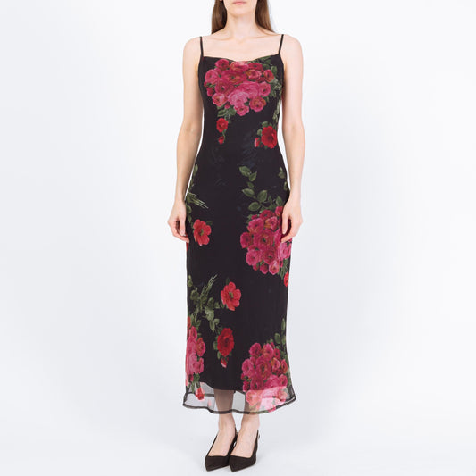 Vintage 90s Black Floral Cowl Neck Maxi Dress - Small