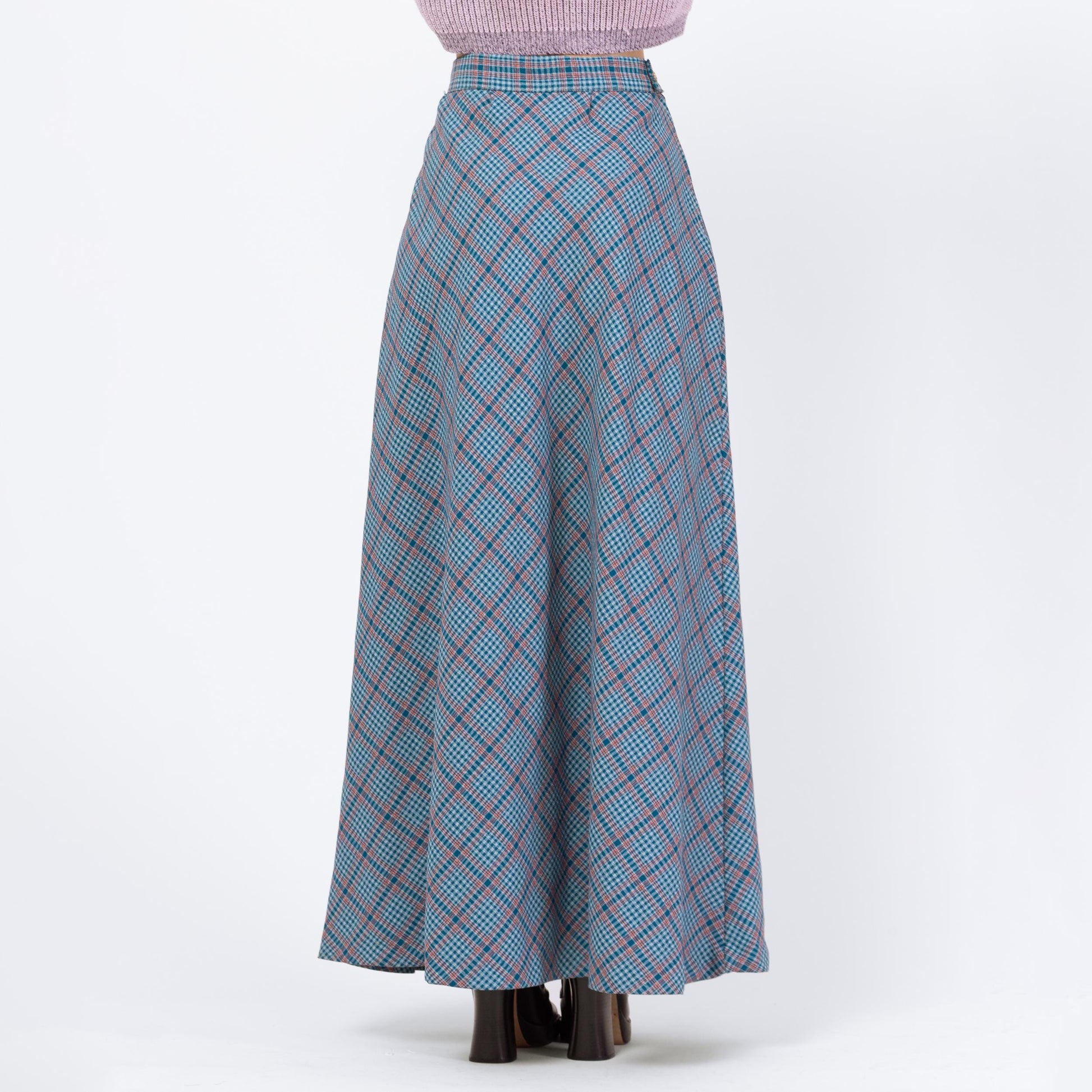 Vintage 70s Blue Plaid Maxi Skirt - Small, 26" Waist
