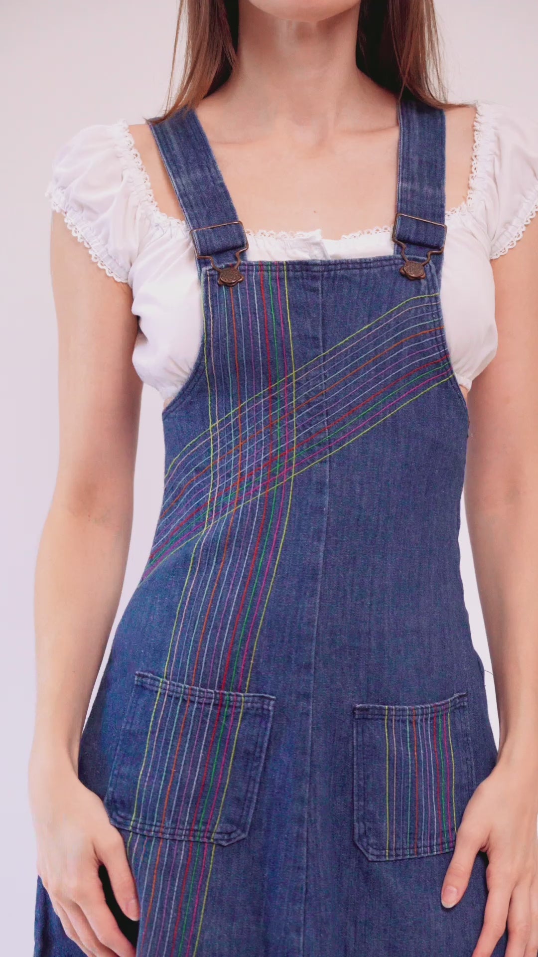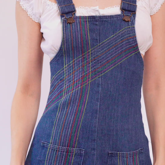 Adorable and rare vintage 70s denim pinafore dress, with rainbow striped stitching. Features overall straps, two lower front pockets, an a-line cut, and a side zipper for closure. Shown styled over a white crop top (not included with purchase).