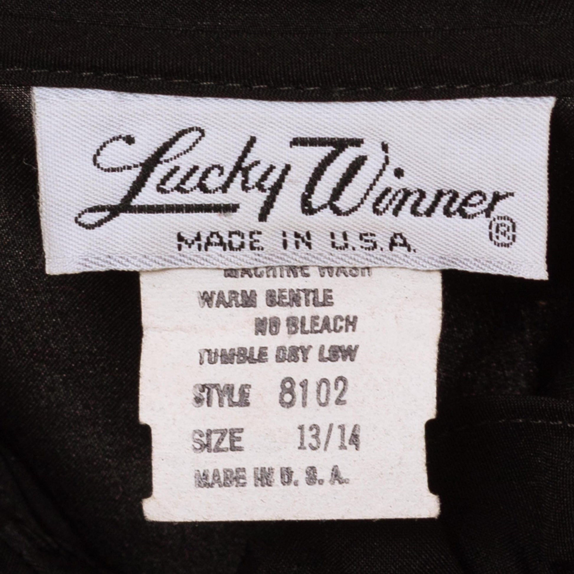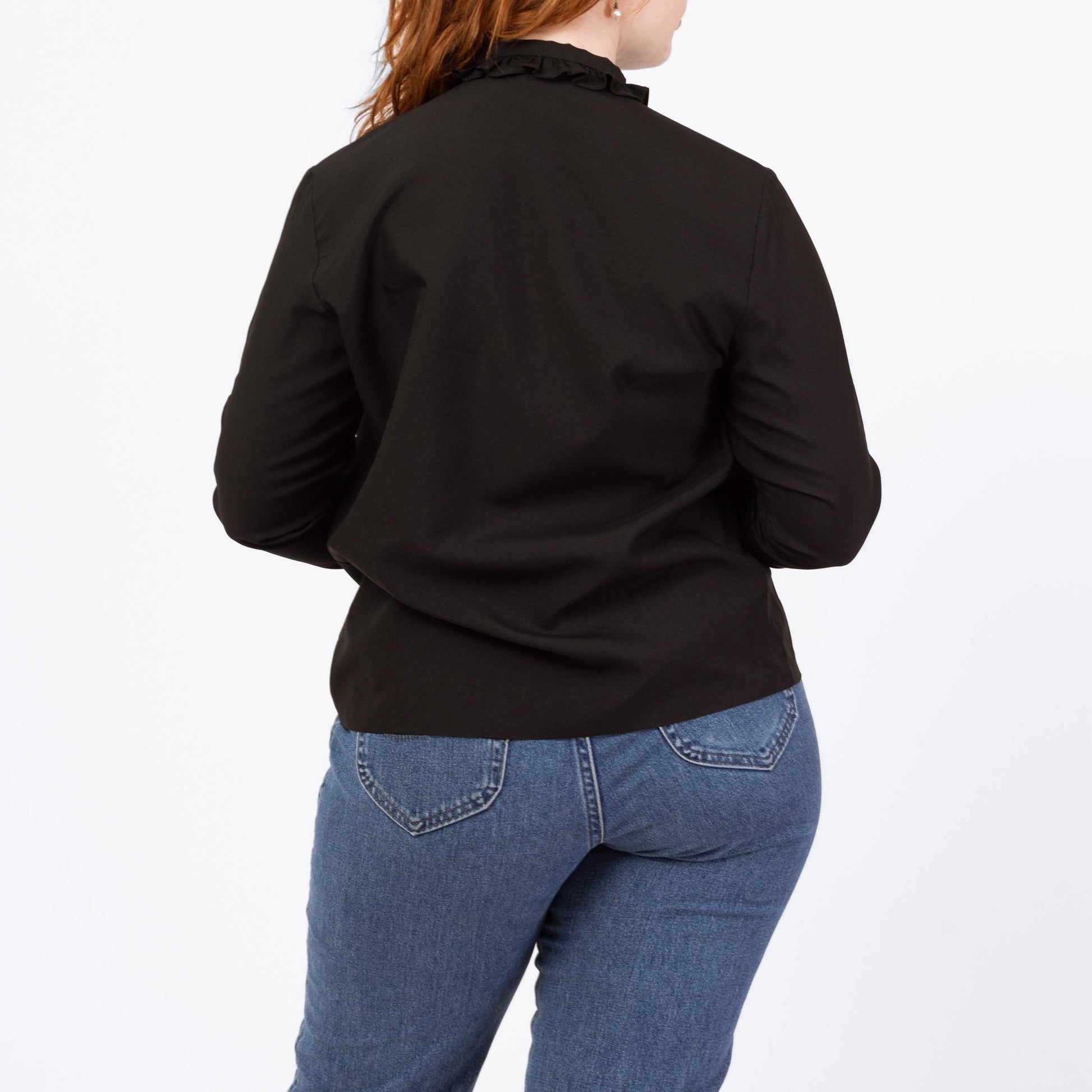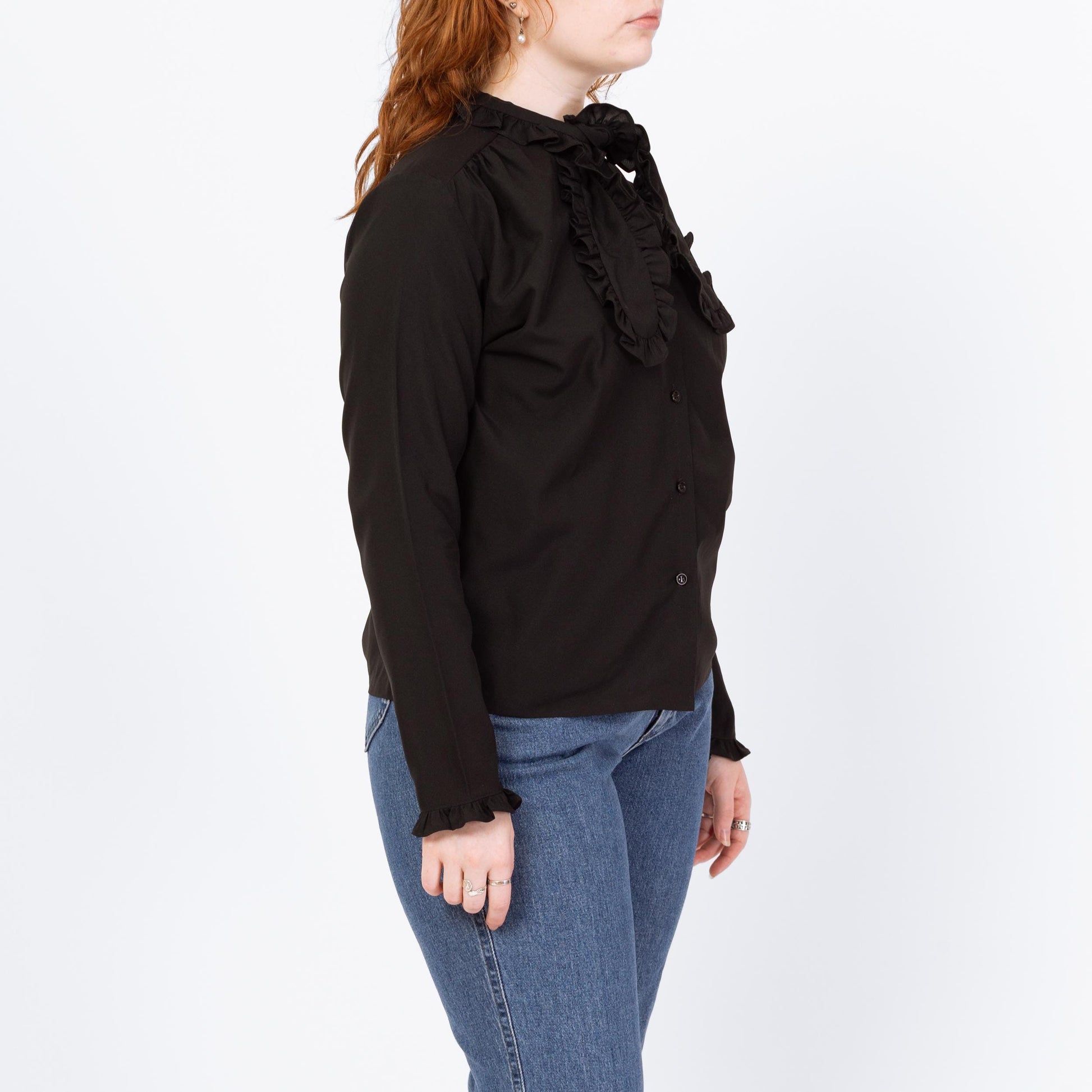 Vintage 70s/80s plain black button up blouse with a super unique ruffed jabot collar. It is shown tied, but it could be also pinned with a decorative brooch if desired.
