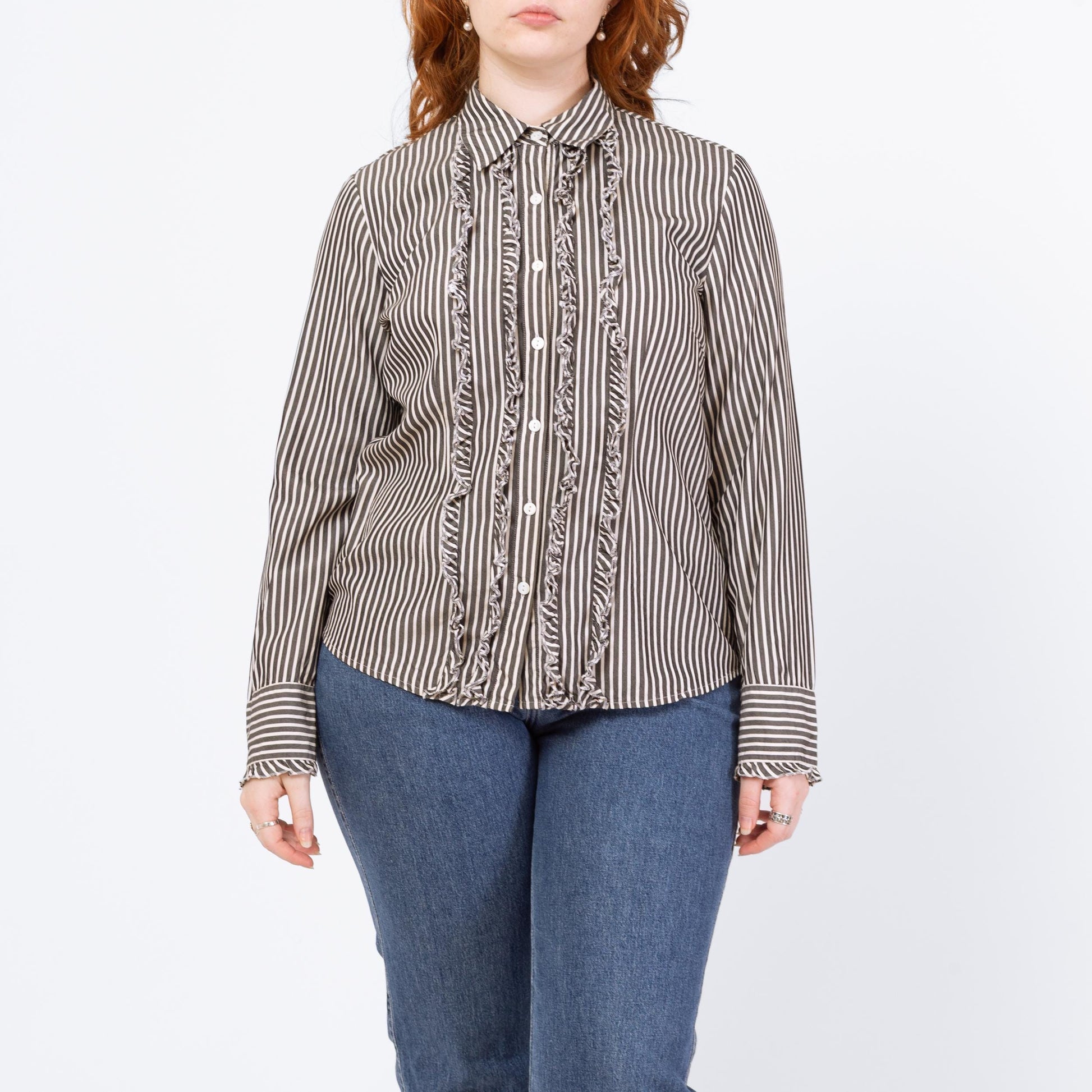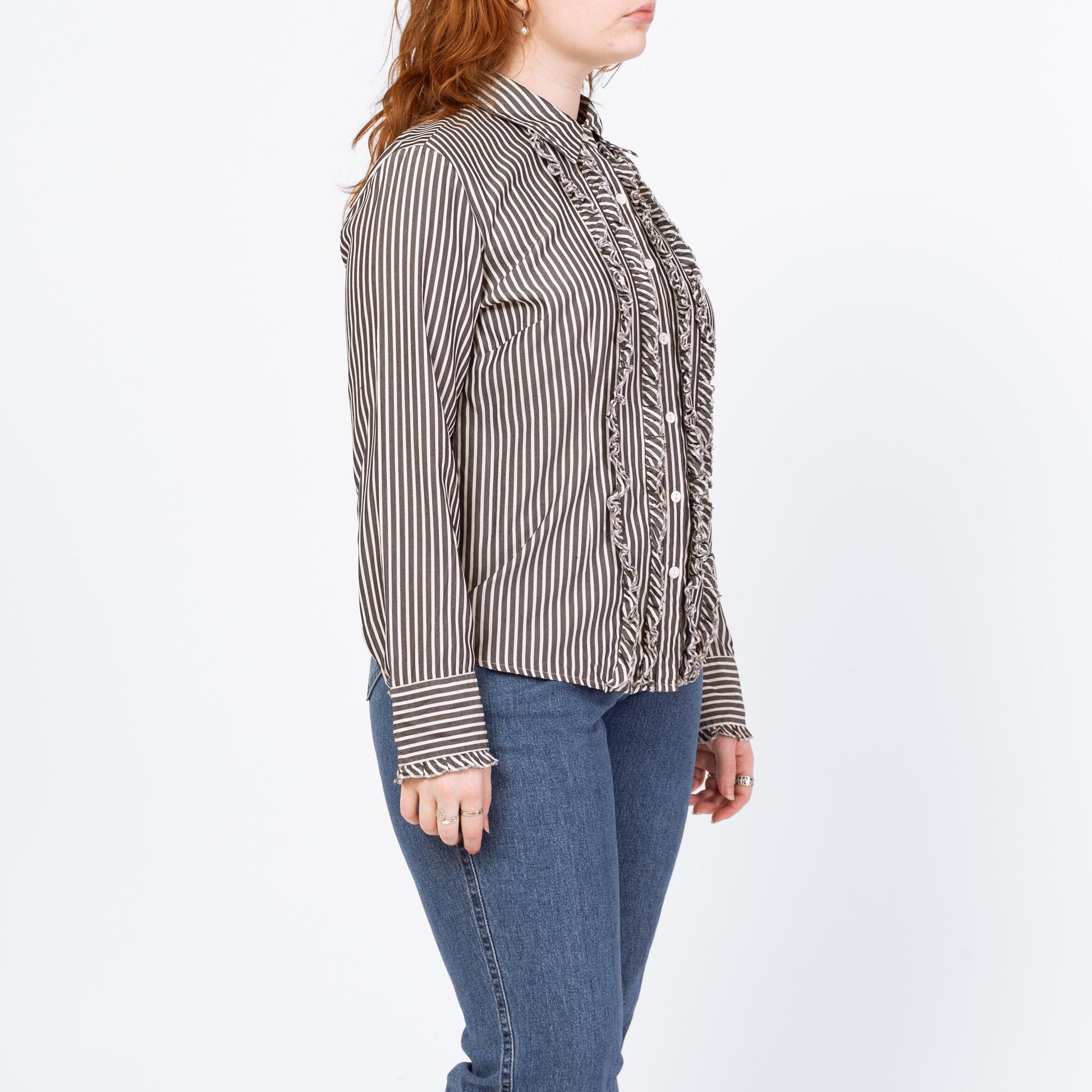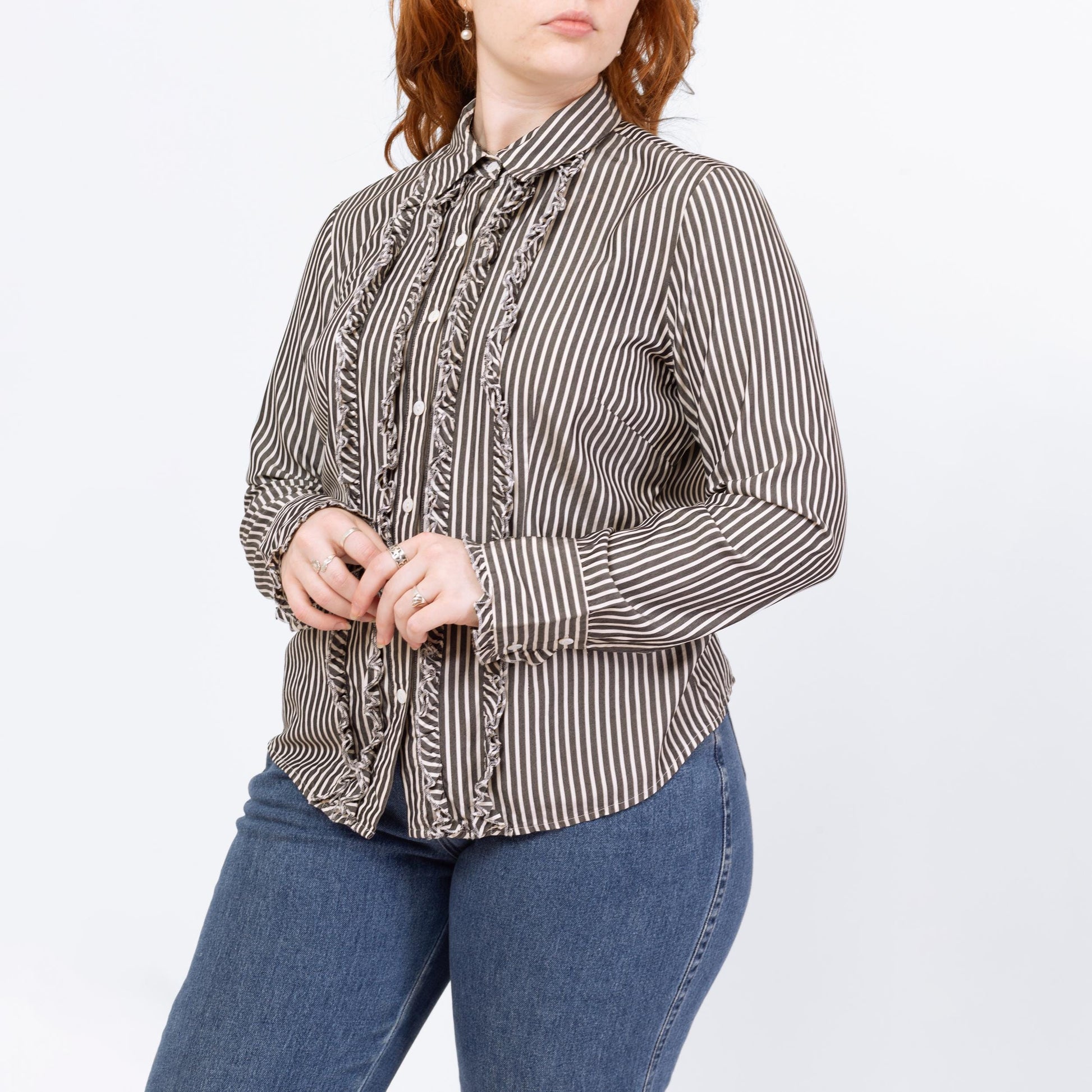 Vintage 90s Black & White Striped Silk Tuxedo Ruffle Blouse - Large