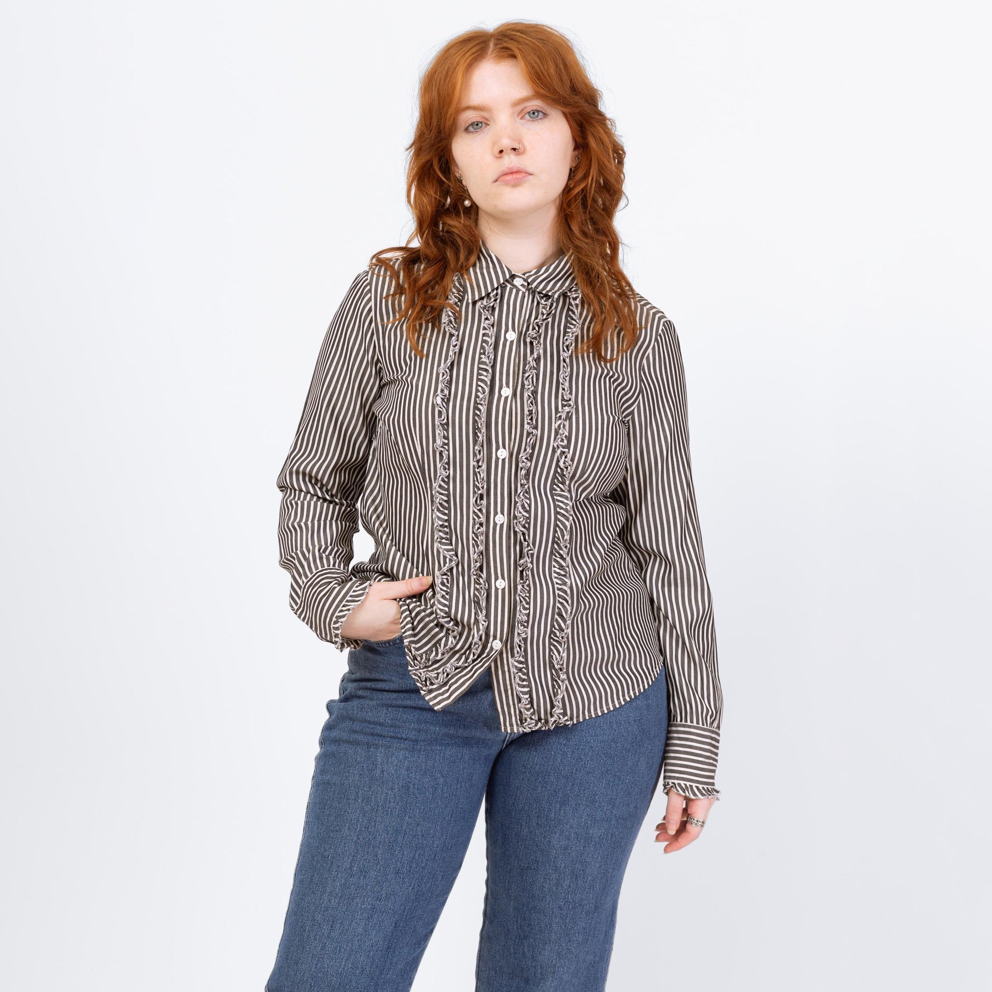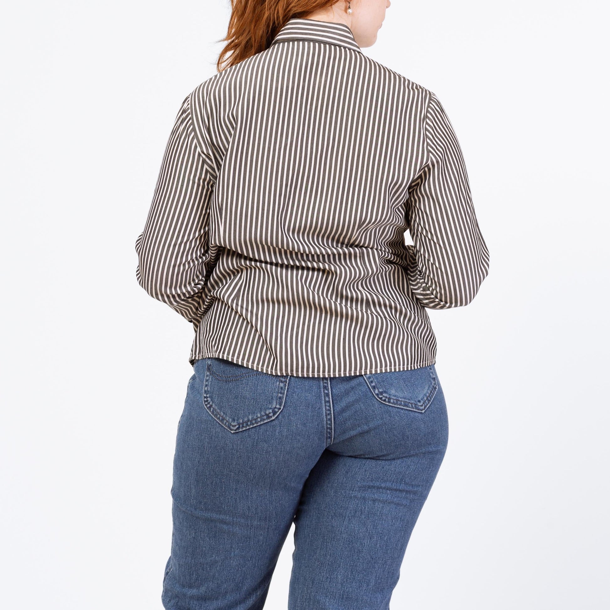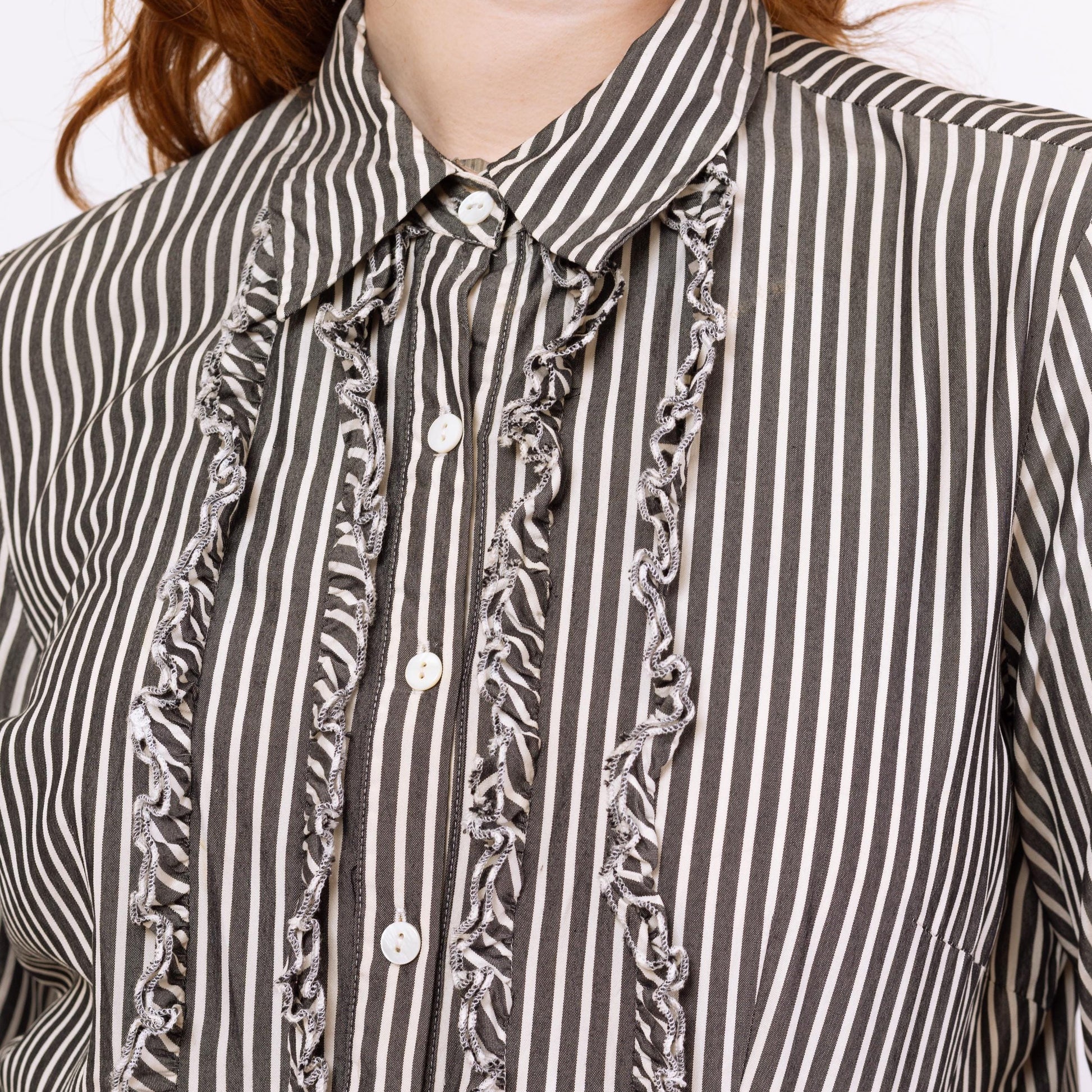 Vintage 90s Black & White Striped Silk Tuxedo Ruffle Blouse - Large