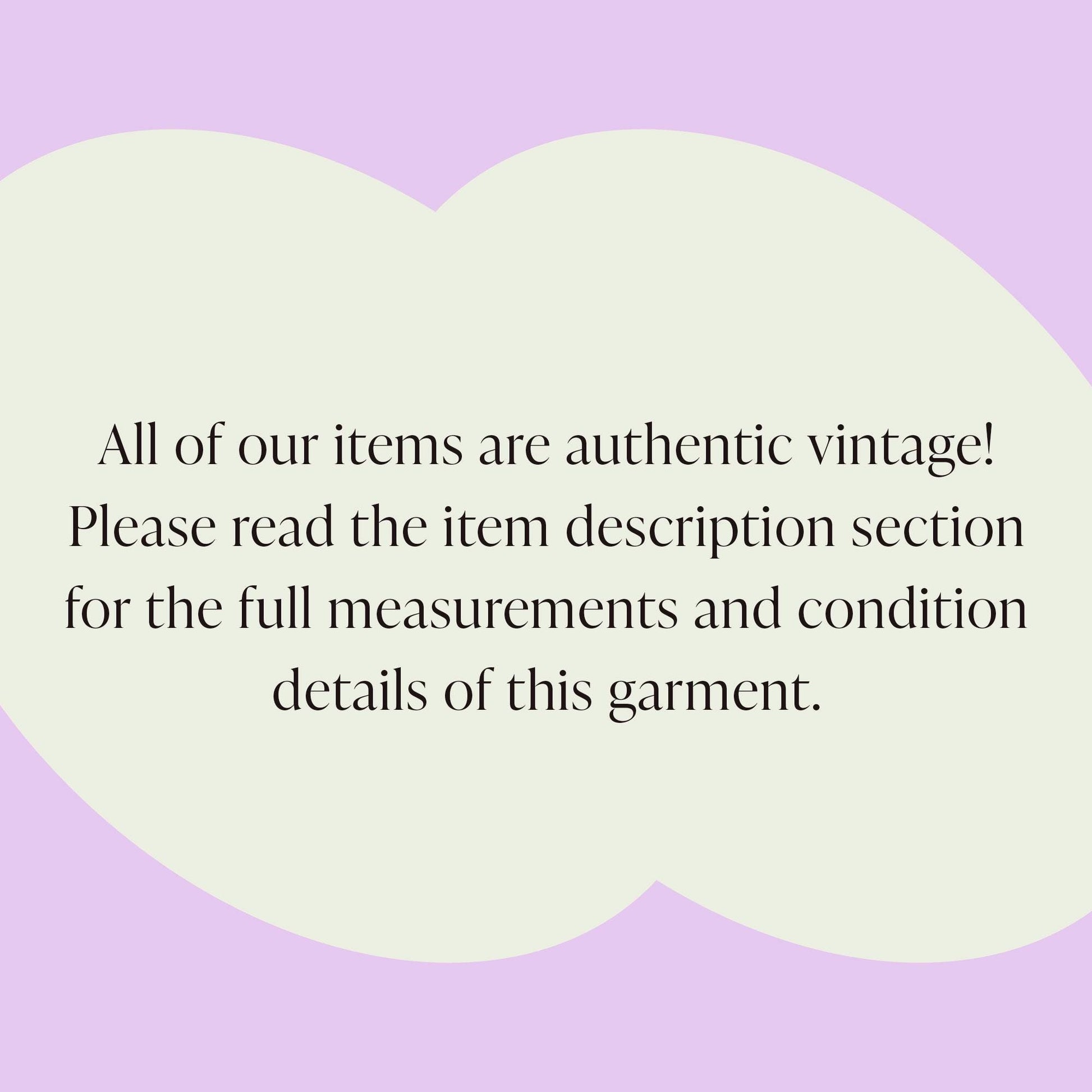 Shopping VintageYou’re looking at an authentic vintage piece! These items have stood the test of time and are the source of inspiration for many modern designers. Due to their unique characteristics we hand inspect and measure each piece so you know exactly how they’ll fit and the condition they’re in. If you ever have a question about an item please contact us!