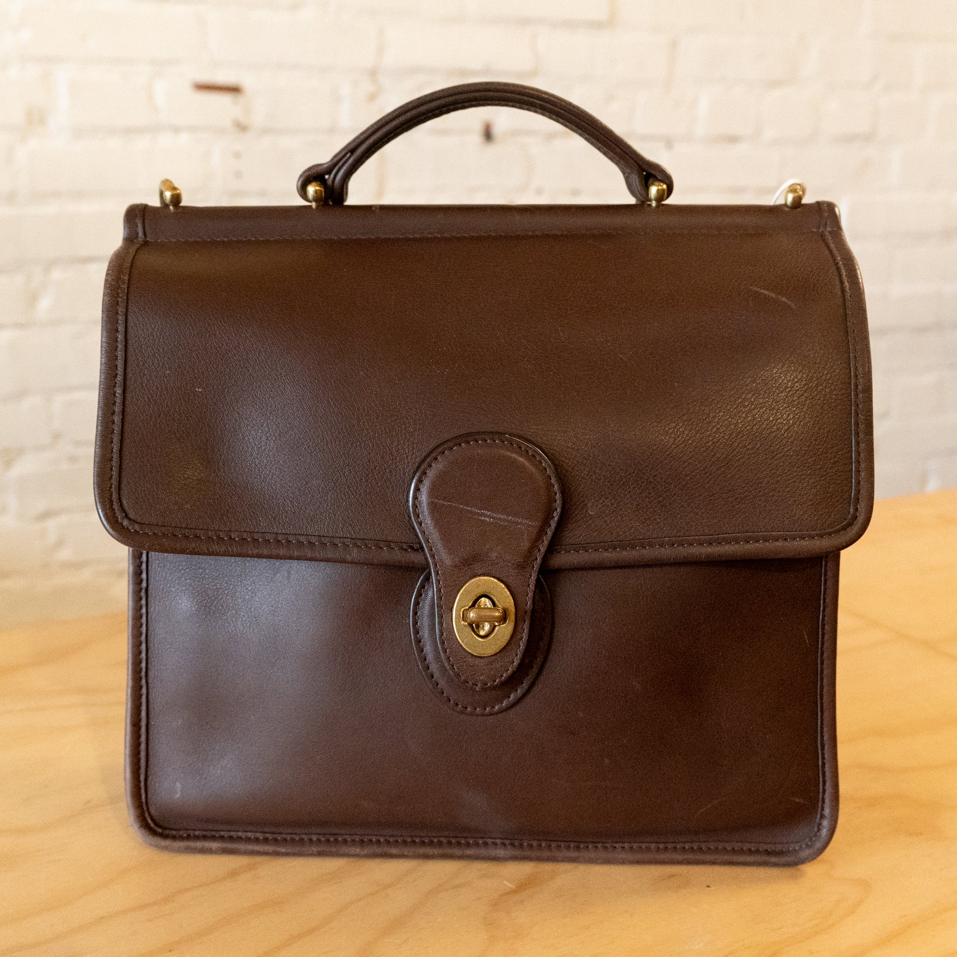 Vintage Coach Willis bag from the early 2000s in rich brown leather. Structured top-handle silhouette with a flap front and brass turn-lock closure. Clean lines and a slightly larger profile than the Regina, with a classic, functional shape. Leather has been conditioned and shows light natural wear with a soft, broken-in feel. Hardware is intact and functional. Includes the original Coach hangtag and adjustable strap for shoulder or crossbody wear. Overall good vintage condition, with a small white scuff above the closure (see photos).